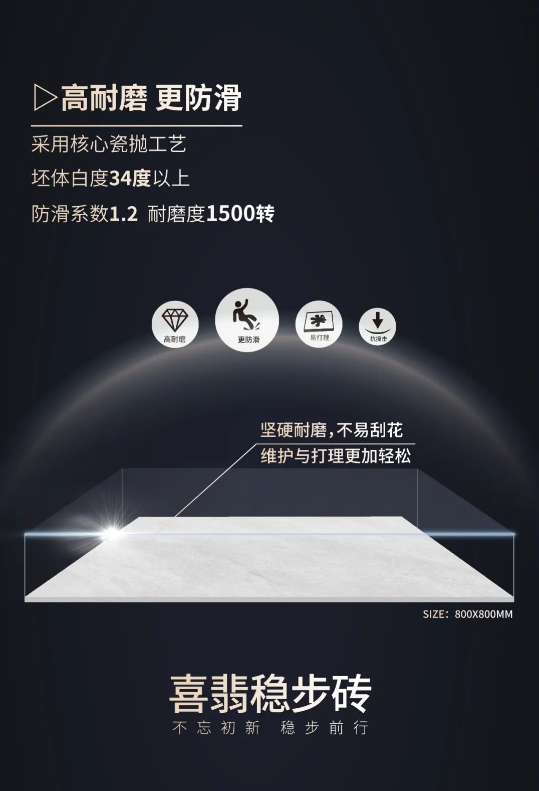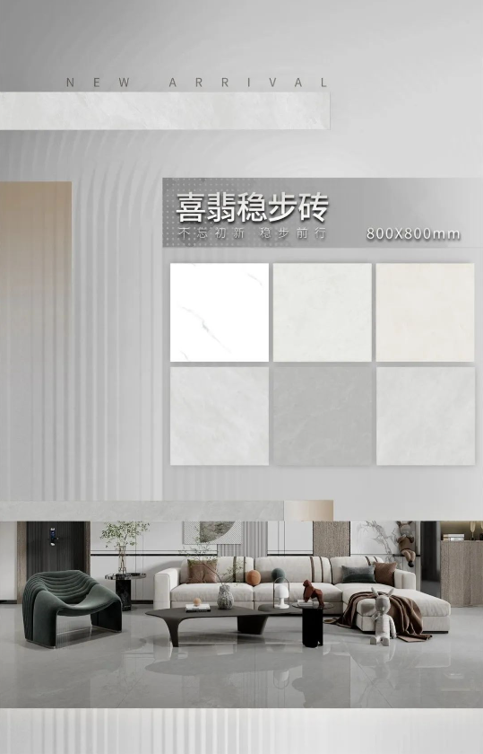 基于對消費需求的深度洞察,2023春季新品“喜翡穩步磚”,遵循極簡主義+實用美學的設計主張,在深化耐磨、防滑性能基礎上,帶來全新肌理、質感等方面的細膩體驗,實力守護品質安全家居。