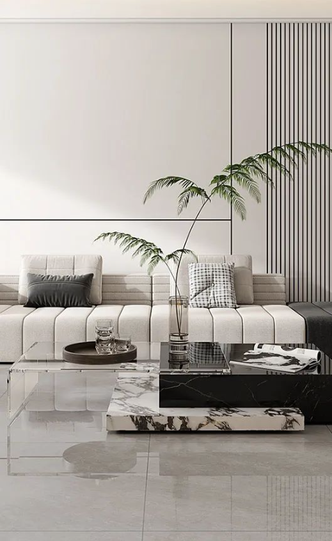 高冷的灰色系瓷磚在降低空間整體明度之余,別具一格的真石紋理設計應用于空間之中,輔以各式各樣的桌椅小擺件,讓陷在沙發里的每一天,都能倍感涼意。