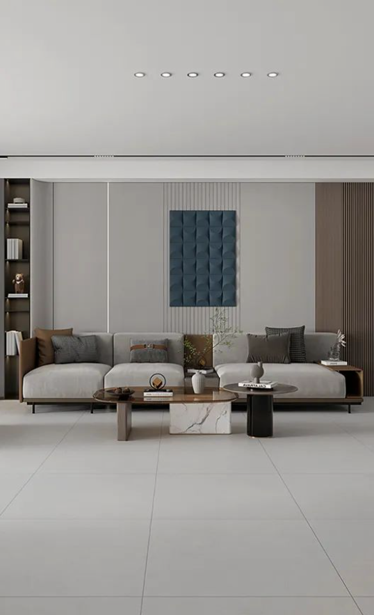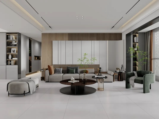 地面采用滿庭芳,表面質(zhì)地柔和,淡淡灰色搭配木質(zhì)背景墻及綠植元素,仿佛被輕紗籠罩,細(xì)膩的紋理和微妙的陰影效果,潔凈無(wú)雜質(zhì),800X800mm經(jīng)典規(guī)格通鋪客廳,清新淡雅中營(yíng)造出質(zhì)樸又高級(jí)的空間氛圍。