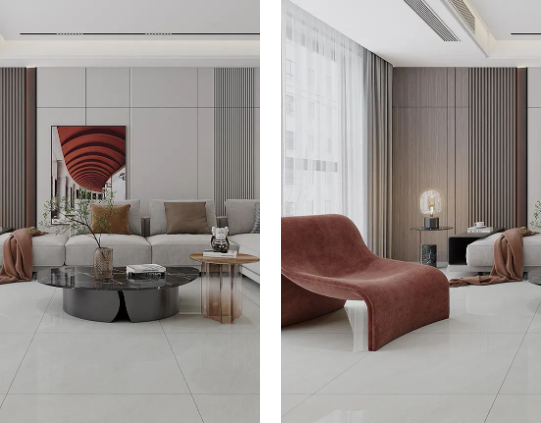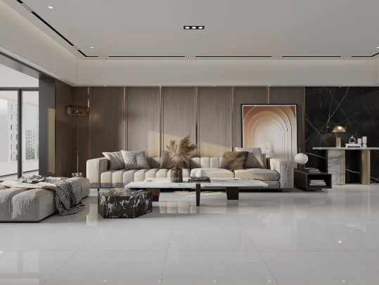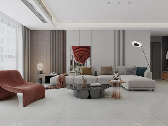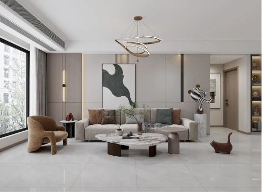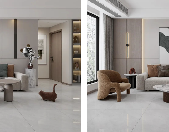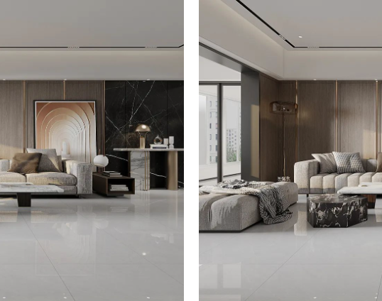 溫馨舒適的原木色,如同冬日暖陽(yáng),悄然無聲潛入室內(nèi),搭配800X800mm規(guī)格的雷恩灰,34°以上的超白坯體,90°的透亮光感,在斑斕的光影中映射著天然石紋的形狀,溫柔細(xì)膩,讓人沉溺其中。